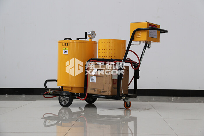 翔工60L手扶瀝青灌縫機采用液化氣加熱系統(tǒng),導(dǎo)熱油循環(huán),使瀝青或灌縫膠快速融化,通過瀝青泵的壓力由出料口出料而達到裂縫處理的效果。通過壓力注射式灌縫,使材料和縫壁緊密結(jié)合,轉(zhuǎn)向靈活的萬向輪追蹤裂縫,使灌縫效果美觀。由于灌縫材料使用瀝青或灌縫膠,在溫度較低時容易凝固,灌縫機配有發(fā)電機組提供整機動力,灌縫機在出料管部位采用恒溫控制系統(tǒng),避免材料燒焦老化,保證出料的順暢。