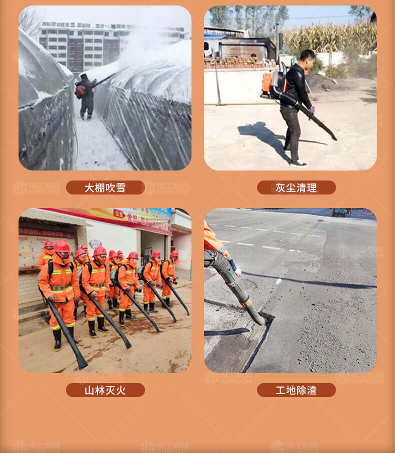 本機(jī)適用于修公路吹灰塵和吹雪,吹雪厚度達(dá)到15公分以上,鐵路上吹沙子,萊大柵溥膜上和露天的變壓器上吹雪(露天變壓器上吹雪時,需再配2.8米的伸縮噴風(fēng)管)。公園內(nèi)吹落葉,院子內(nèi)吹雪及森林防火等.