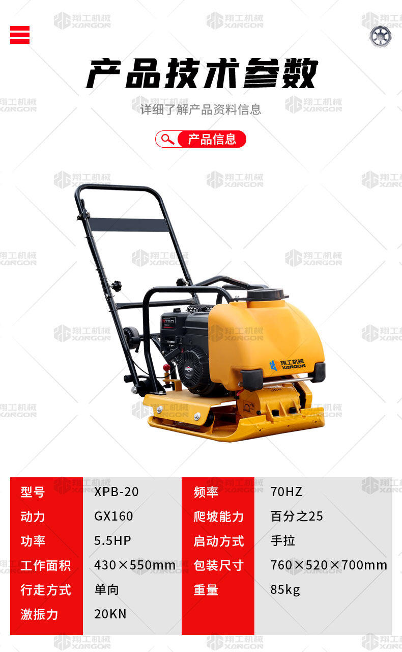 單向平板夯XPB-20適用于路基邊緣、橋涵、管道、溝槽底部等狹長地帶的壓實(shí)。 HONDA動(dòng)力,性能優(yōu)越,啟動(dòng)容易 采用單獨(dú)懸掛式強(qiáng)力減震機(jī)構(gòu),減少對發(fā)動(dòng)機(jī)的沖擊,提高操作人員的舒服感;