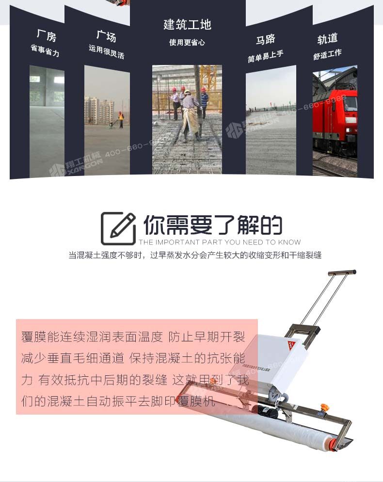 混凝土自動振平去腳印覆膜機主要是用于混凝土澆筑的工作中,此款設(shè)備澆筑后會進行覆膜養(yǎng)護,防止水分蒸發(fā)過快造成的脫水,混凝土自動振平去腳印覆膜機助力推動覆蓋薄膜養(yǎng)護普及進程,保證混凝土施工效果。