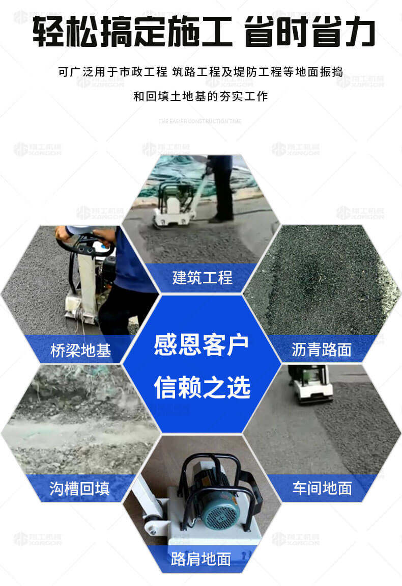 可廣泛的使用于建筑工程,預(yù)制構(gòu)件廠,筑路工程及堤防工程等混凝土表面振搗和回填土,地基的夯實(shí)工作。
