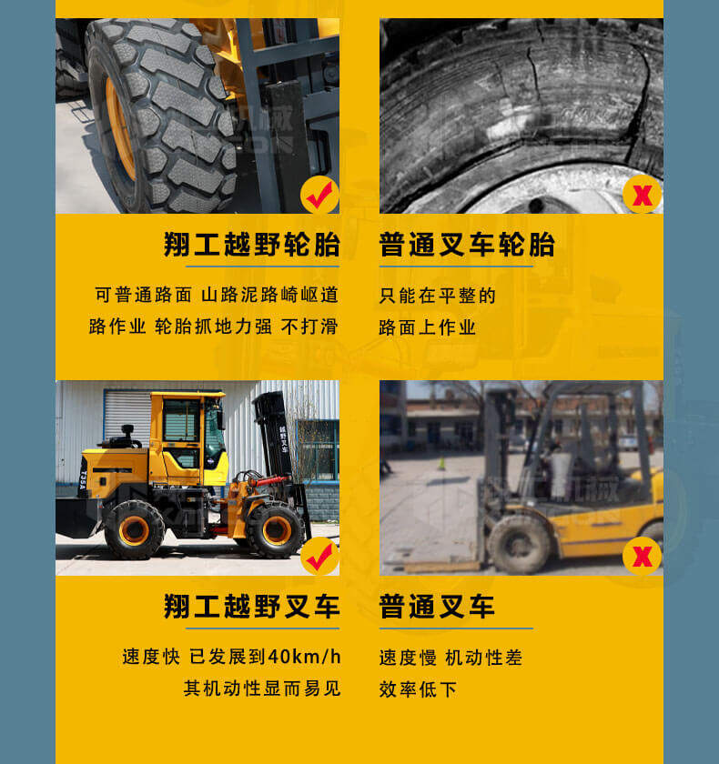 3.普通叉車只能在平整的路面上作業(yè),而越野叉車既可以在普通路面上作業(yè),還可以在山路泥路崎嶇道路作業(yè),輪胎抓地力強,不打滑。
