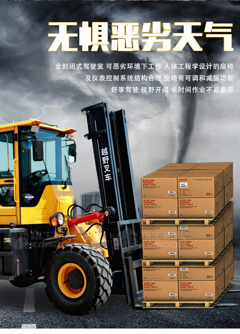 3.普通叉車只能在平整的路面上作業(yè),而越野叉車既可以在普通路面上作業(yè),還可以在山路泥路崎嶇道路作業(yè),輪胎抓地力強(qiáng),不打滑。