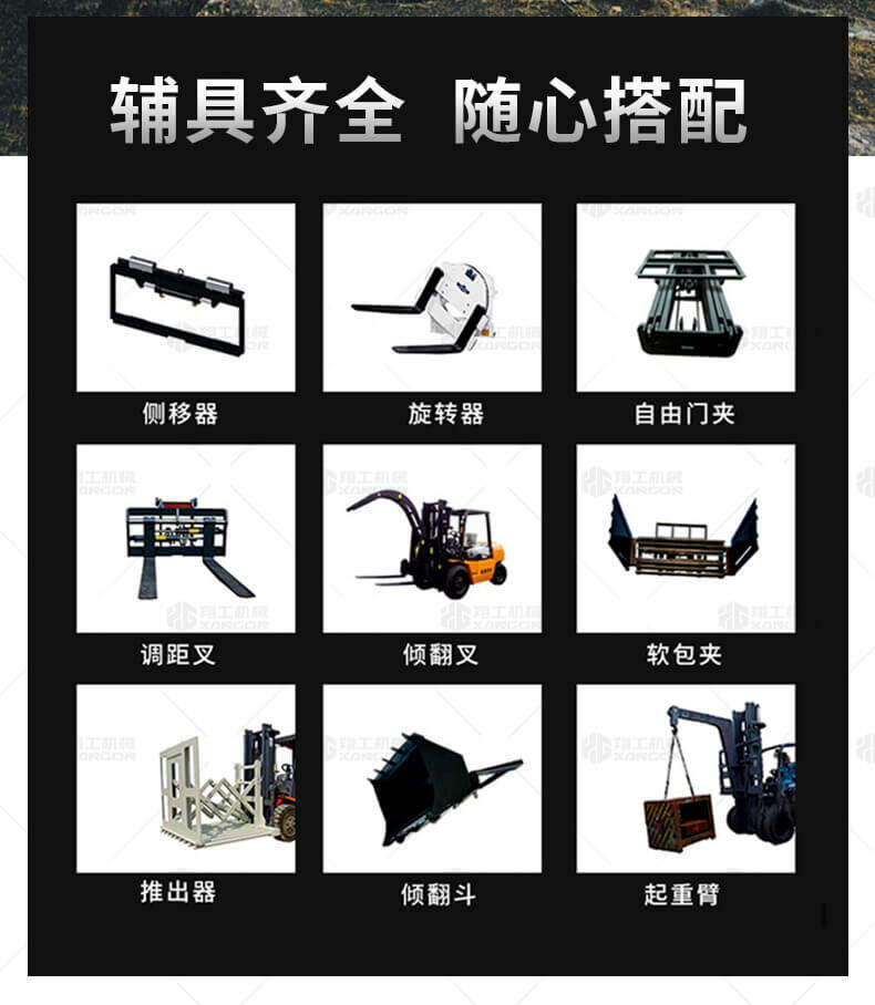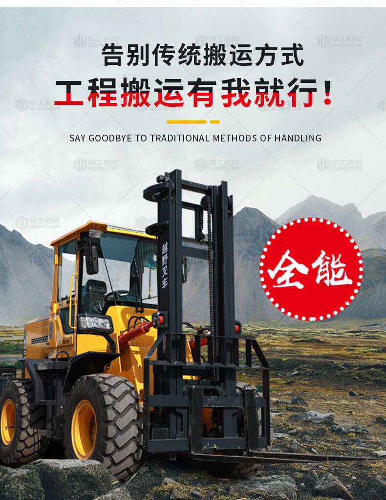 越野叉車可以在坡地和不平地面上進(jìn)行貨物裝、卸、堆垛及搬運(yùn)作業(yè),具有良好的機(jī)動性、越野性可靠性。其功能多樣,可搭配側(cè)移器、調(diào)距叉、旋轉(zhuǎn)器、軟包夾、推出器、側(cè)翻叉、側(cè)翻斗、起重臂等工具完成不同的工作。