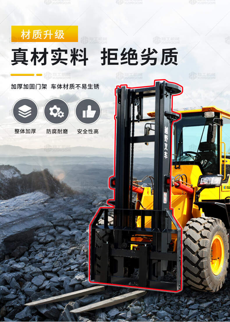 5.越野叉車發(fā)動機(jī)功率大,采用全輪驅(qū)動和越野輪胎。