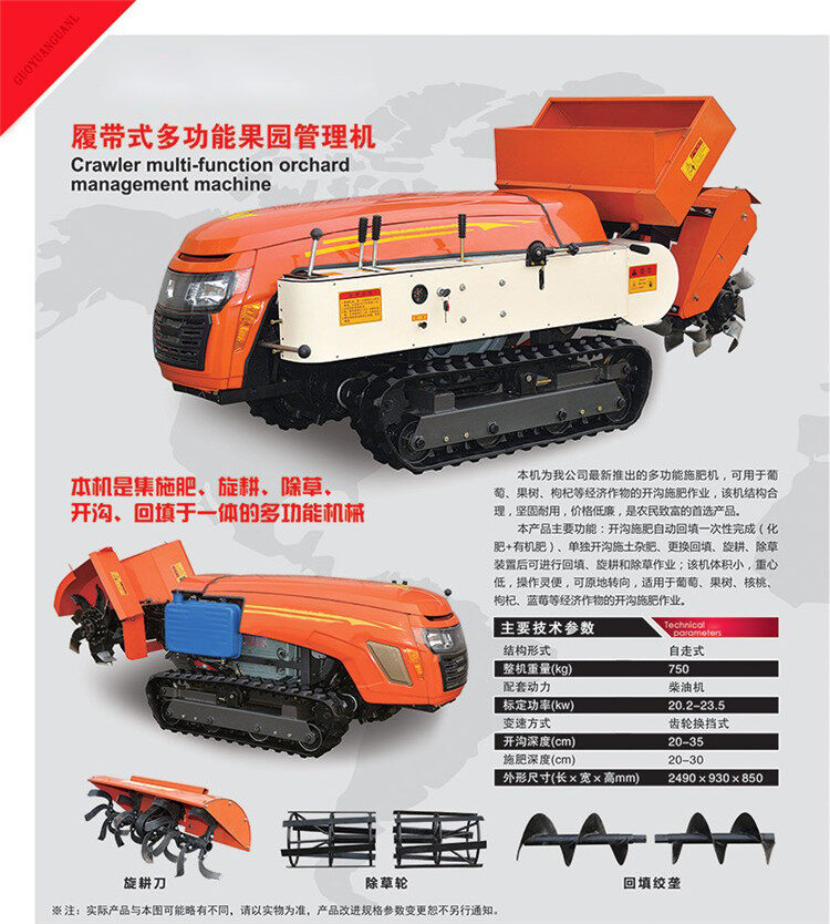 開溝施肥自動回填一次性完成(化肥+有機肥)、單獨開溝施土雜肥、更換回填、旋耕、除草裝置后可進行回填、旋耕和除草作業(yè);該機體積小,操作靈便,可原地轉(zhuǎn)向,適用于葡萄、果樹、核桃、枸杞、藍莓等經(jīng)濟作物的開溝施肥作業(yè)。