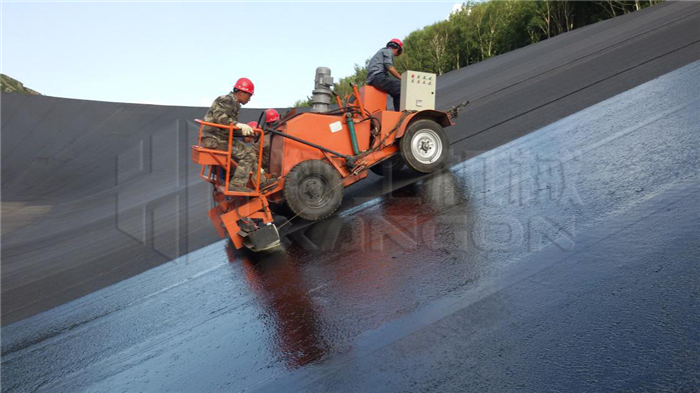 瀝青封閉層的施工采用適合于斜坡施工的專用瀝青瑪蹄脂涂刷機(jī),在牽引臺(tái)車的牽引下沿著面板從下往上涂刷。涂刷完一個(gè)條帶后,將涂刷機(jī)移動(dòng)至下一個(gè)條帶繼續(xù)涂刷。瑪蹄脂封閉層涂刷作業(yè)時(shí)環(huán)境氣溫應(yīng)在10℃以上,涂刷溫度一般在170℃~190℃;施工完成的封閉層表面禁止無(wú)關(guān)人員和機(jī)械行走;特殊部位:壩頂及曲率半徑較小的圓弧斷,采用小型機(jī)械涂刷方式進(jìn)行機(jī)械涂刷進(jìn)行,環(huán)庫(kù)水平段及弧段全部采用小刮涂機(jī)配合人工進(jìn)行刮涂施工。
