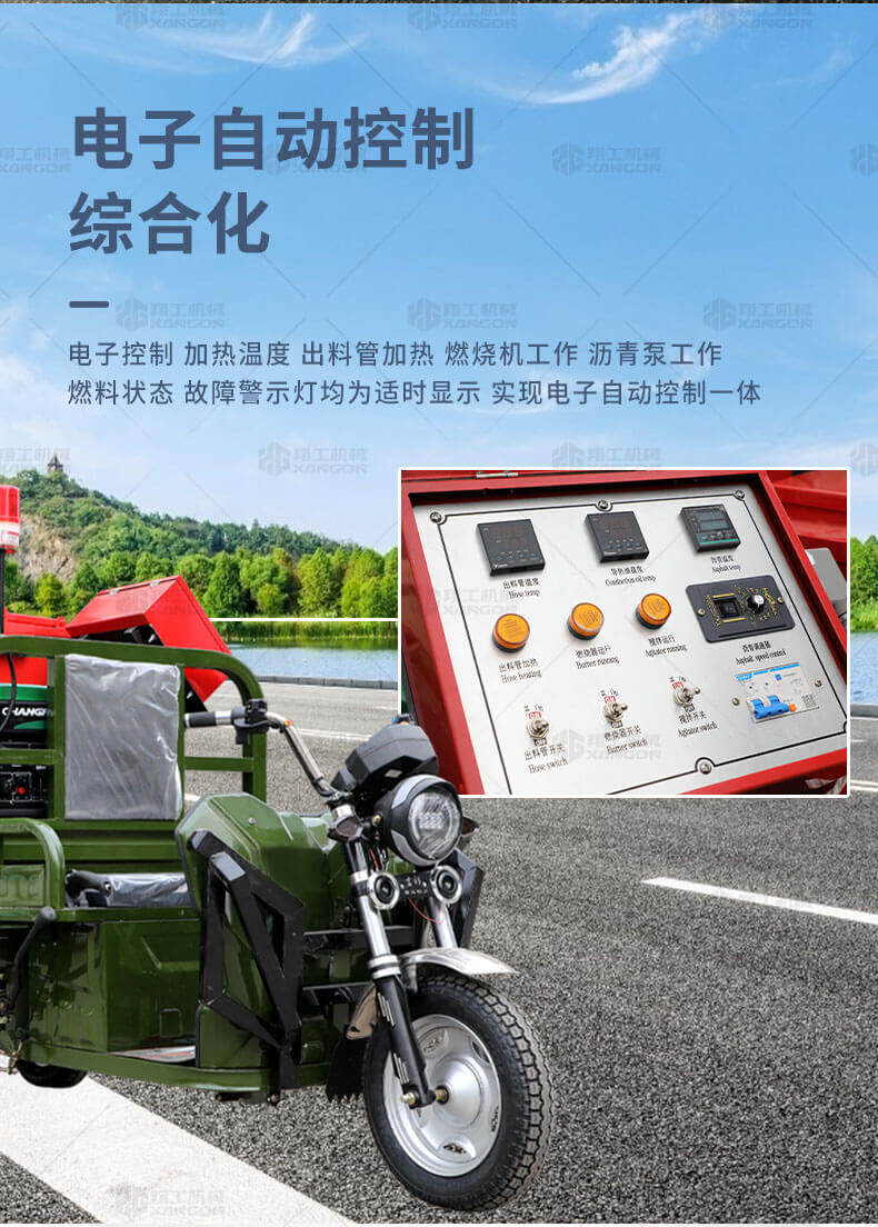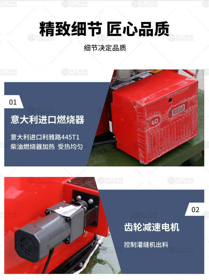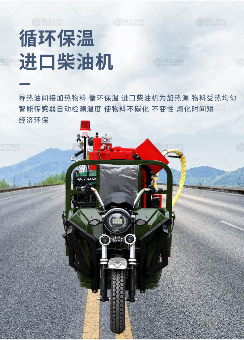 主要用于瀝青或水泥路面裂縫瀝青灌縫。汽油灌縫機(jī)主要有手推式和自行式手持灌縫管操作,采用進(jìn)口柴油燃燒器加熱。在工作時(shí)首先在料箱內(nèi)加入瀝青或灌縫膠,啟動(dòng)發(fā)電機(jī)供電,依次間斷打開導(dǎo)熱油泵開關(guān),燃燒器開關(guān),出料管加熱開關(guān);調(diào)整自動(dòng)溫控系統(tǒng)與材料的溫度相同,通過(guò)柴油燃燒器自動(dòng)加熱熔料箱內(nèi)導(dǎo)熱油開始升溫(拖式為強(qiáng)制循環(huán))使材料融化,溫度是通過(guò)自控系統(tǒng)來(lái)控制。溶料時(shí)間大約30-40分鐘左右。在材料融化、出料管溫度達(dá)到后可以進(jìn)行工作。手持灌縫管對(duì)正裂縫灌縫處理。瀝青泵的出料流量可調(diào)。在工作過(guò)程中隨時(shí)添加材料保證工作的連續(xù)性。