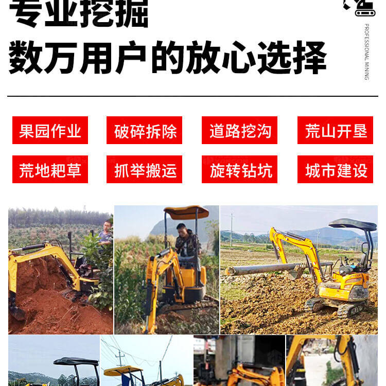挖掘機(jī)廣泛應(yīng)用于果園苗圃、園林綠化、山地開荒、農(nóng)田改造、開挖自來水機(jī)電纜管道、室內(nèi)拆除、地面破碎、蔬菜大棚、養(yǎng)殖場(chǎng)、各種礦井及地道施工等。