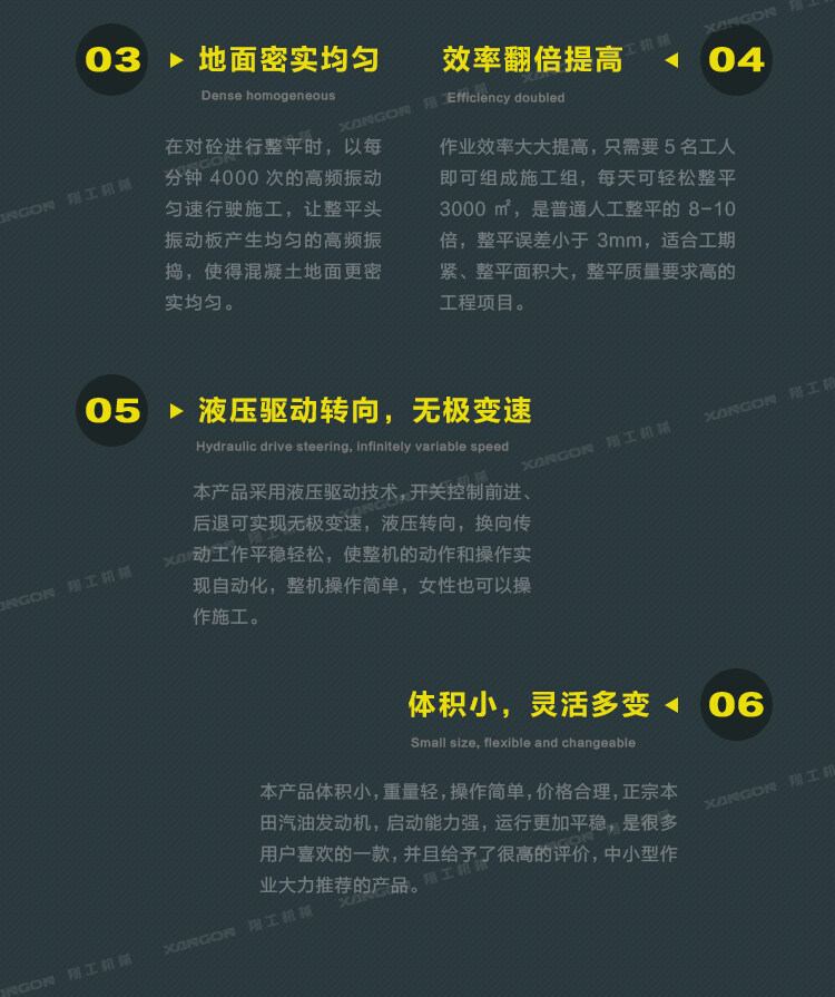 3,本產(chǎn)品能一次性鋪設(shè)混凝土基層,將其抹平將其震蕩光滑,您的工作速度將大大提高,因?yàn)樵摍C(jī)器自動(dòng)設(shè)定標(biāo)高,使得操作員快速的通過工作區(qū)域;